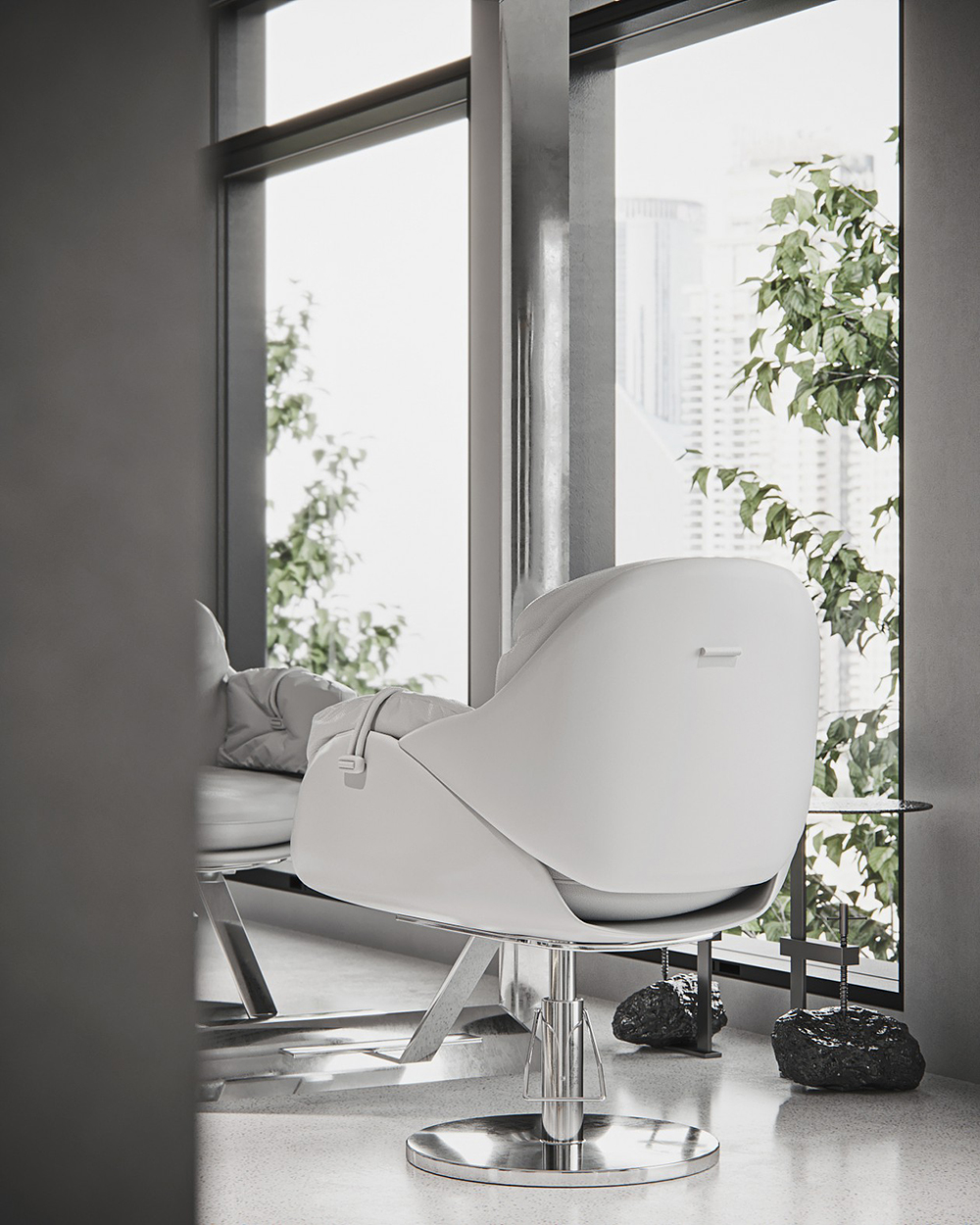 整體設(shè)計(jì)以大面積白色為主,設(shè)計(jì)凸顯了原始材料的價(jià)值,使其成為個性化的表達(dá),傳遞出事物沒有高低貴賤之分的美好價(jià)值觀。要創(chuàng)造出一種非凡獨(dú)特的體驗(yàn)。當(dāng)客戶光臨的時候,一個極簡的空間內(nèi)所有的焦點(diǎn)應(yīng)該在理發(fā)師以及他們所駐足的位置上。