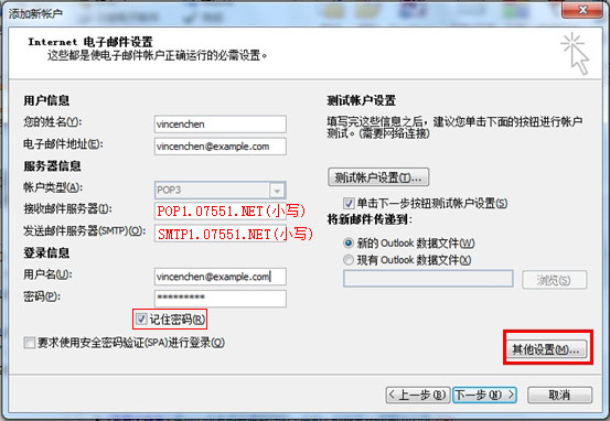 其中,接收郵件服務(wù)器是pop1.07551.net和發(fā)送郵件服務(wù)器smtp1.07551.net。填寫完后,點擊“其他設(shè)置”。