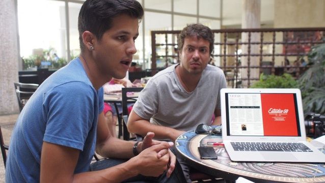 《Vistar》興辦者兼構(gòu)思總監(jiān)羅賓·佩德拉加(左)和他的兄弟、AlaMesa聯(lián)合創(chuàng)始人揚(yáng)戴爾·古鐵雷斯?!禫istar》是有關(guān)古巴年青人文明的電子雜志,AlaMesa是有關(guān)古巴飯館的網(wǎng)站和移動(dòng)運(yùn)用。