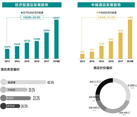 滿足居民百姓日益增長的住宿需求的仍然占據(jù)主流市場(chǎng)空間,針對(duì)酒店類型、價(jià)位偏好調(diào)研顯示,經(jīng)濟(jì)型酒店仍是出行首選。但隨著商務(wù)人士以及國內(nèi)外游客的旅游消費(fèi)升級(jí)使得酒店需求趨于多元化,中端的個(gè)性化需求快速增長,中端酒店正進(jìn)入規(guī)?;目焖侔l(fā)展期。而且,相比經(jīng)濟(jì)型酒店,中端酒店的拓展過程中外部進(jìn)入的行業(yè)競爭者沒有那沒多。高端酒店的發(fā)展將更加關(guān)注個(gè)人消費(fèi)的細(xì)分需求,提供個(gè)性而高質(zhì)量的服務(wù)。