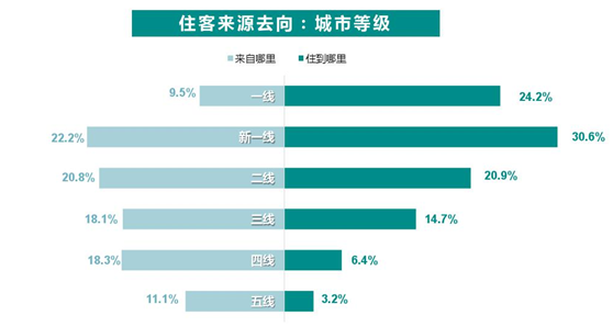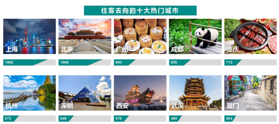 在對(duì)住客的去向及地點(diǎn)偏好調(diào)查中,五成以上用戶選擇住到一線及新一線城市的酒店,在住客最喜歡的城市排行中,北上廣依舊是最熱門城市,成都、重慶、杭州、西安、武漢五大新一線城市皆入圍。