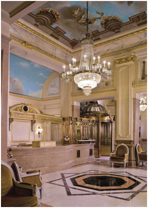 總服務臺頂面的壁畫具有典型的裝飾作用,搭配金色的線腳和水晶吊燈顯得輝煌大氣