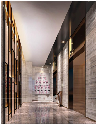 地面石材顏色以靠近墻面為主,使整個空間在色彩上協(xié)調一致。以上各部分構成了一個光鮮靚麗豪華潔凈的大堂,有效貫穿了豪華現代的設計理念。