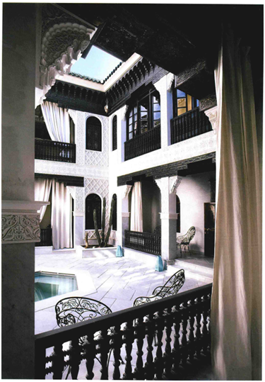 摩洛哥風(fēng)格代表的是一種特有居住環(huán)境造就的極休閑的生活方式,大部分摩洛哥居住建筑建立在伊斯蘭教地區(qū)的傳統(tǒng)教義之上。對(duì)于阿拉伯人來說,室外空間留給工作之用,而室內(nèi)空間則是避難所,因此他們將主要的精力用于裝飾室內(nèi)特別是中心庭院,表現(xiàn)出富麗堂皇的特色。因?yàn)橐了固m教注重保護(hù)婦女的隱私,房屋往往圍繞一個(gè)中心庭院而布局,中間的三重拱形觀景走廊引向2-4間對(duì)稱布置的房間,房間的形狀通常狹長(zhǎng)而又高聳。