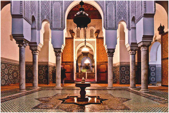 阿拉伯人將波斯的鑲瓷技藝傳入摩洛哥,并在結(jié)合羅馬鑲瓷技藝上得到了發(fā)展。波斯人采用藍(lán)色和白色這一早期從中國(guó)傳入的典型色彩;藍(lán)色瓷磚和黃色瓷磚是葡萄牙人占領(lǐng)摩洛哥港的見證;而綠色瓷磚受更早時(shí)期羅馬統(tǒng)治的影響。摩洛哥在此基礎(chǔ)上不斷創(chuàng)新,形成獨(dú)具特色的色彩鮮艷、裝飾華麗的彩色陶瓷技藝,享有七色板的美譽(yù)。