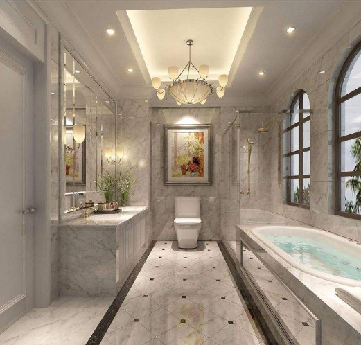 臺面與妝鏡是衛(wèi)生間造型設(shè)計的重點,要注意面盆上方配的石英燈照明和鏡面兩側(cè)或單側(cè)的壁燈照明,二者建議做到都不缺。